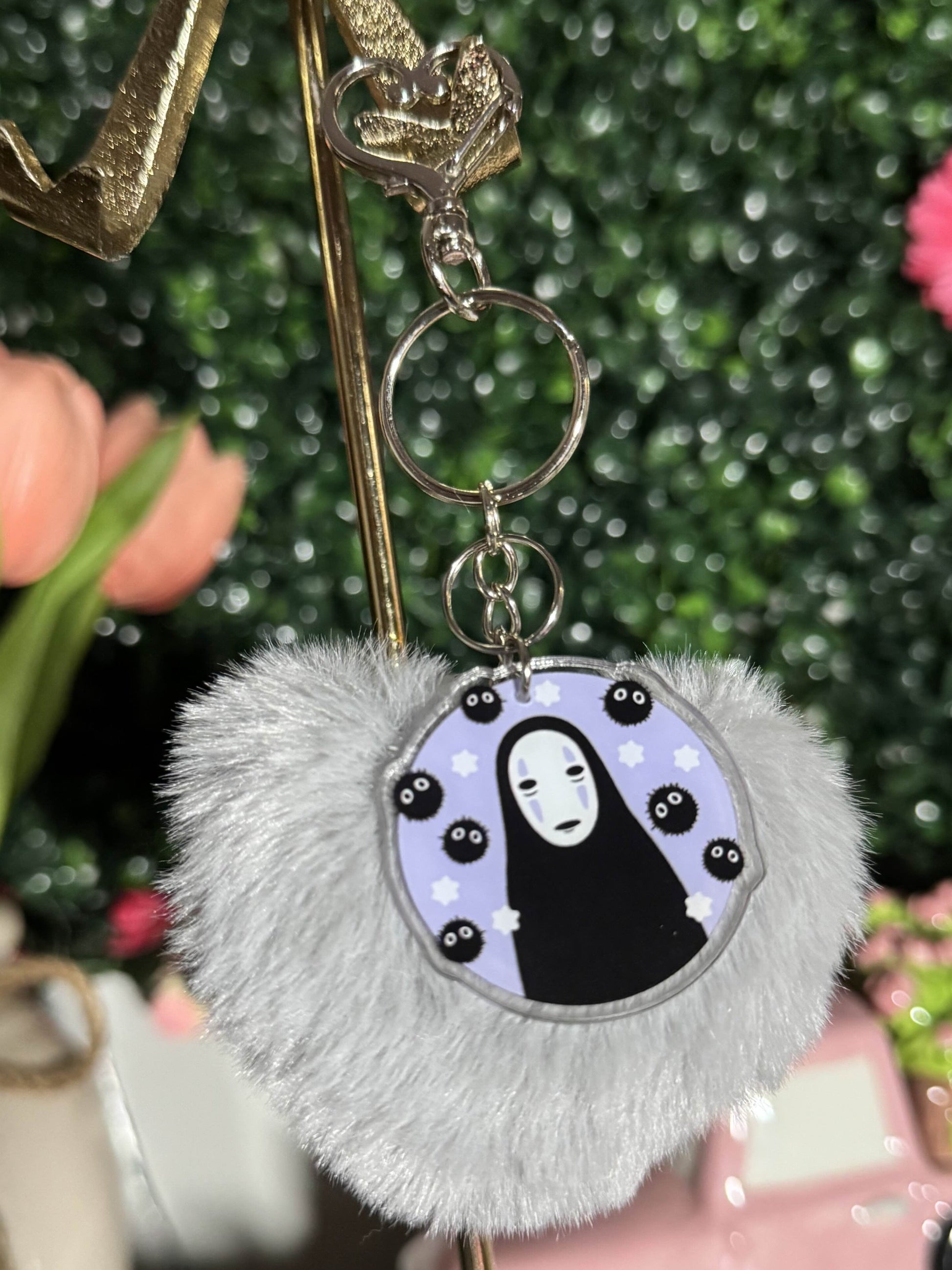 Material: Acrylic no face charm, fluffy heart pom-pom, silver heart keychain ring.